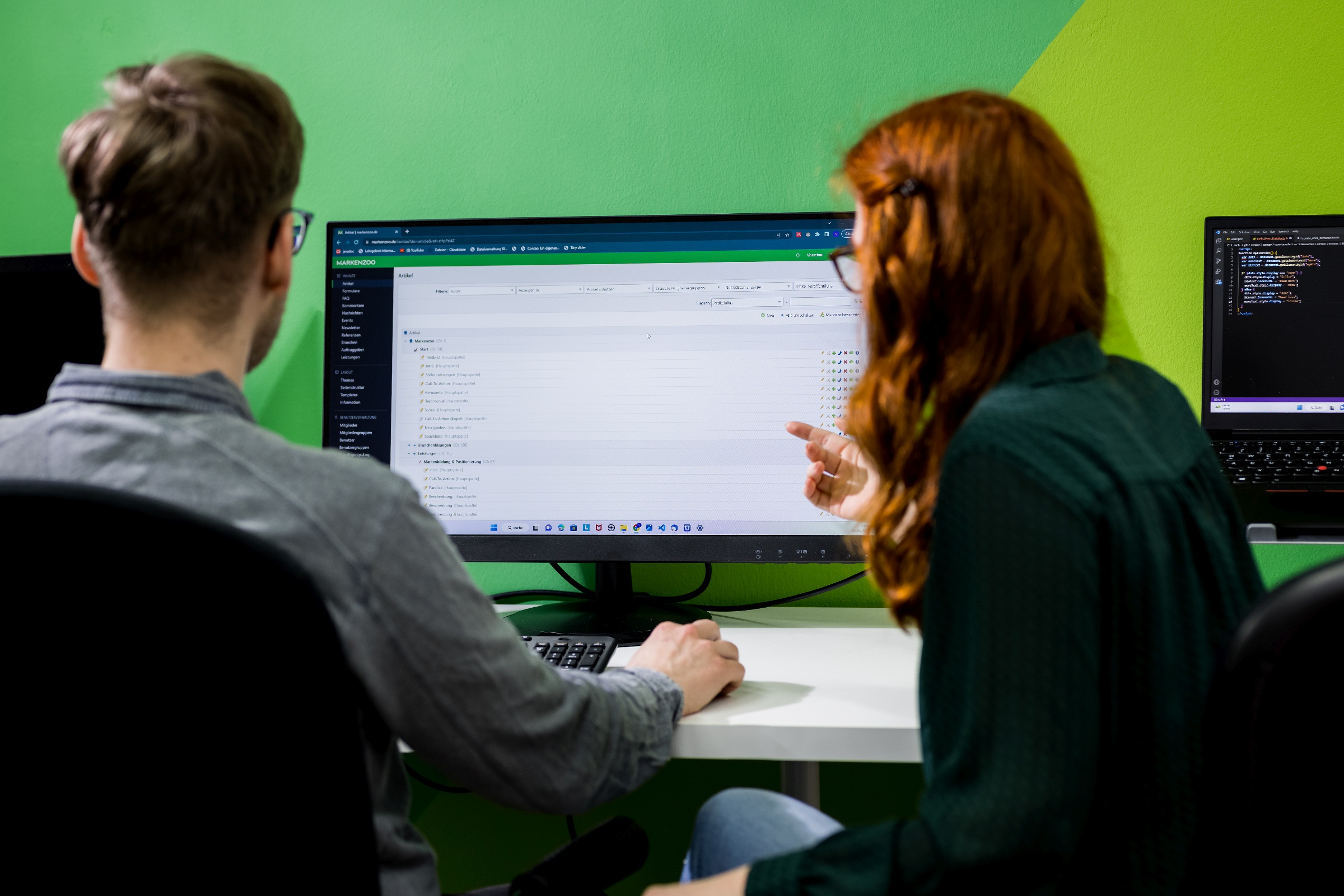 Die Front-End-Entwicklung bezieht sich auf die Benutzeroberfläche, das heißt Webentwickler bauen das, was die Nutzenden sehen. Es wird direkt am dargestellten Bild angeknüpft. Im Gegensatz dazu wird bei der Back-End-Entwicklung, wie der Name schon verrät, alles von hinten aufgerollt. Ein Beispiel für ein Open Source Content Management System ist Contao. Inhaltselemente – wie Texte oder Bilder – werden im Hintergrund über einen Nutzerzugang zur Website angepasst und Datenbanken werden aufgebaut. Daraus entsteht schließlich die gewünschte Benutzeroberfläche.